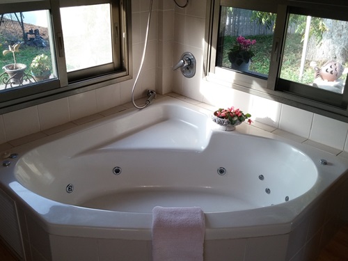 חדר הרחצה כולל אמבטיה בבקתות וג'קוזי מפנק בסוויטות, מגבות ותחליבי רחצה.