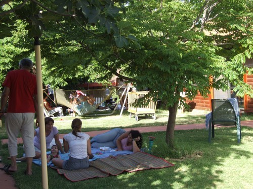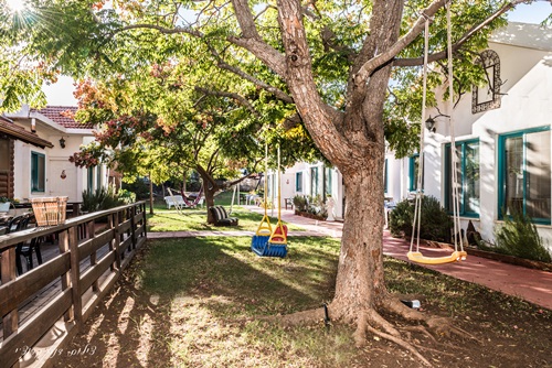 בחצר המתחם: פינות ישיבה מוצלות, מדשאה גדולה ומטופחת, צמחייה פורחת ועצי פרי, ערסלים גדולים, רחבת ברביקיו ותאורת לילה.