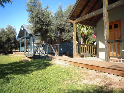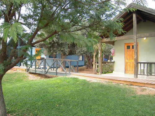 הבקתות מוקפות במדשאה רחבה וירוקה ומופרדות זו מזו.
