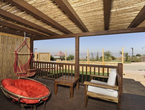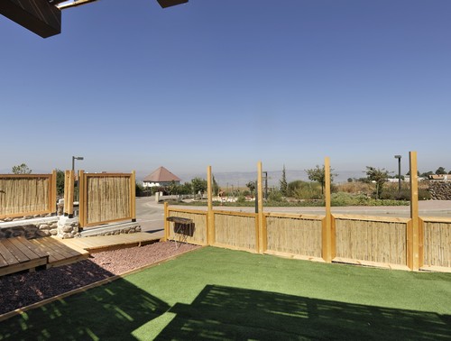 בחזית הסוויטה מרפסת פרטית דק עם ריהוט חצר וערסל, חצר גדולה עם דשא, פינת מנגל ונוף מרהיב להרי נפתלי, עמק החולה ופסגת החרמון.