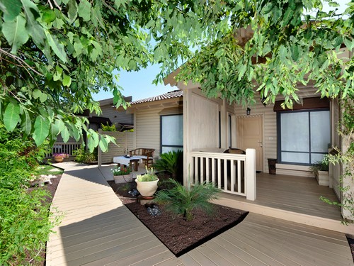 לכל צימר מרפסת פרטית הפתוחה לנופו המרהיב של הירדן ההררי ומאוישת בספסל עץ ושולחן.