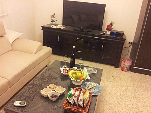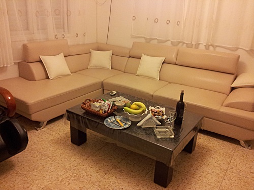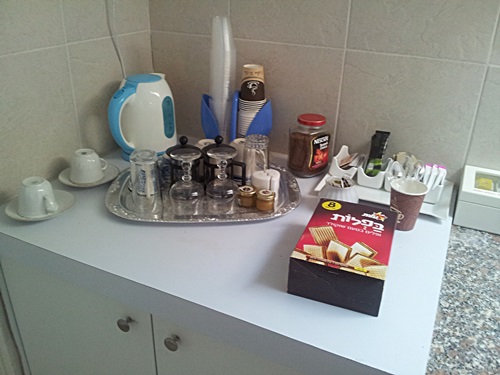 פינת קפה עשירה ומגוונת עם חלב, עוגיות, פירות העונה, בקבוק יין ושוקולדים ובמקרר שתייה קרה חופשית לשימוש האורחים.
