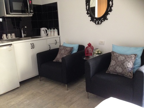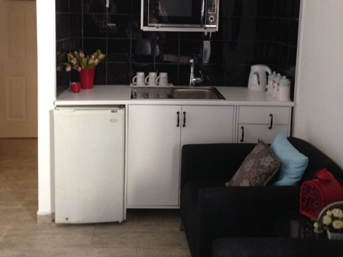 - מטבחון שמאובזר בנוחות עם פינת קפה ותה, מקרר, כיריים ומיקרוגל.
